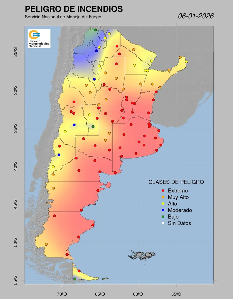 El Servicio Nacional de Manejo del Fuego (SNMF) y el Servicio Meteorológico Nacional (SMN) declararon un “riesgo extremo de incendios ” para casi toda la Argentina, lo que involucra a un total de 16 provincias.