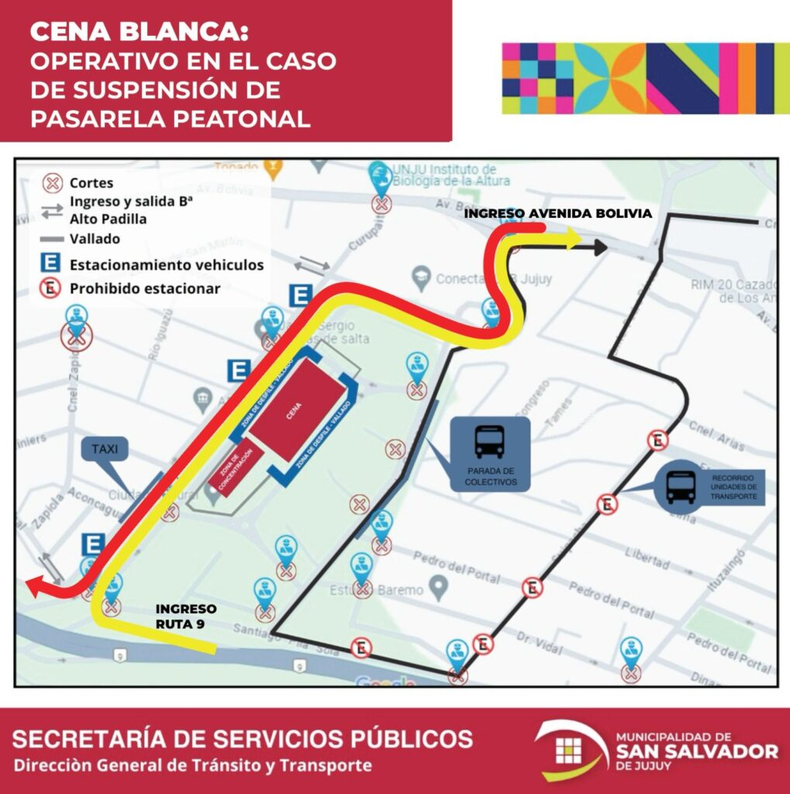 La Municipalidad de San Salvador de Jujuy, a través de la Dirección de Tránsito y Transporte de la Secretaría de Servicios Públicos, informó el operativo especial que se aplicará este sábado 6 de diciembre, con motivo de la realización de la tradicional Cena Blanca 2025 en Ciudad Cultural, desde las 18 horas.