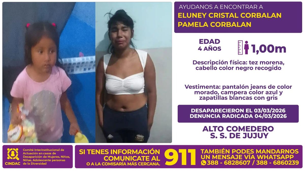 El CINDAC activó la búsqueda de la niña Eluney Cristal Corbalán y de Pamela Corbalán. Solicitan colaboración para dar con el paradero.