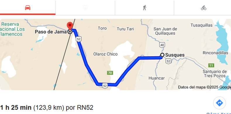 La distancia por ruta desde Susques, Jujuy, hasta el Complejo Fronterizo de Paso de Jama es de aproximadamente 155 kilómetros, con un tiempo estimado de viaje en coche de alrededor de 1 hora y 20 minutos. Este tramo corresponde a la Ruta Nacional Nº 52, que está asfaltada y en buenas condiciones, y conecta directamente Susques con el paso fronterizo ubicado a una altitud de unos 4.200 metros sobre el nivel del mar.