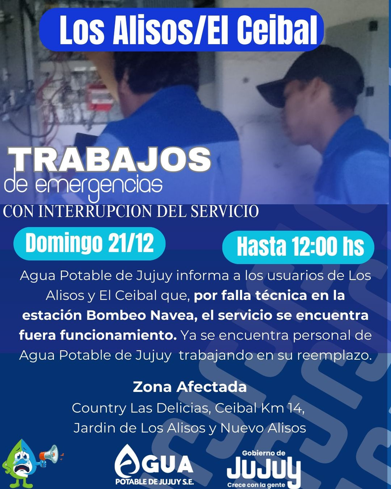 Ante esta situación, personal de Agua Potable de Jujuy se encuentra trabajando en el lugar para realizar el reemplazo de la bomba afectada y normalizar el sistema a la brevedad en la zona de Los Alisos y El Ceibal.