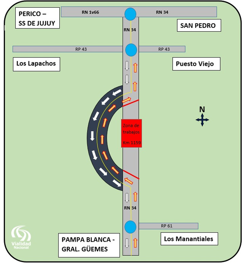Se implementara un desvío vehicular permanente en el km 1190,6 al km 1192,6 de la ruta nacional 34 a la altura de San Pedro de Jujuy, hasta que se completen los trabajos de construcción.