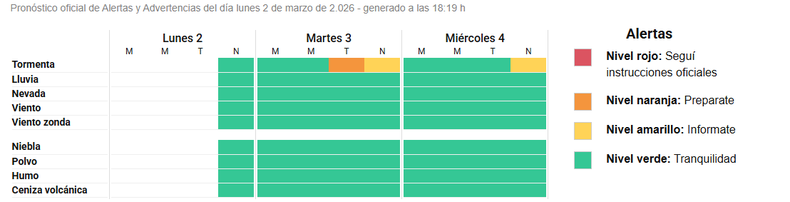 Además hay alerta amarilla para: Zona montañosa de Doctor Manuel Belgrano – Zona montañosa de Humahuaca – Zona montañosa de Tilcara – Zona montañosa de Tumbaya.