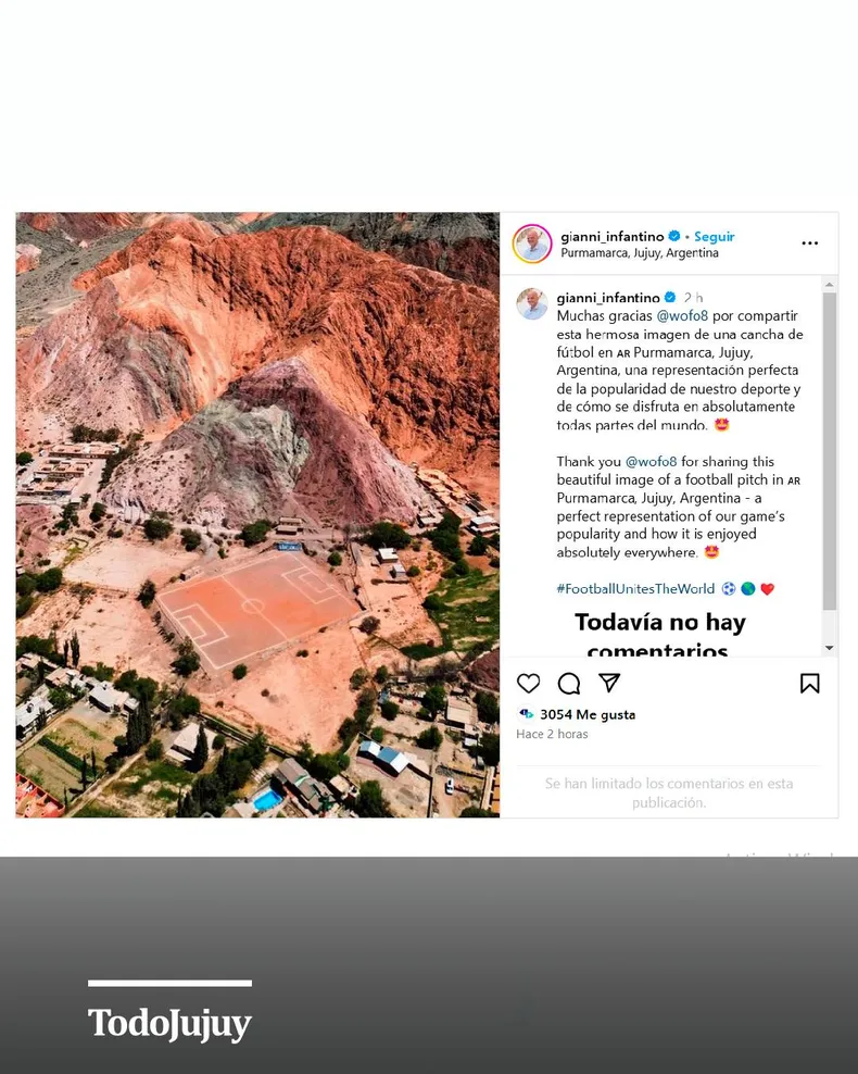 “Muchas gracias @wofo8 por compartir esta hermosa imagen de una cancha de fútbol en Purmamarca, Jujuy, Argentina, una representación perfecta de la popularidad de nuestro deporte y de cómo se disfruta en absolutamente todas partes del mundo” “Muchas gracias @wofo8 por compartir esta hermosa imagen de una cancha de fútbol en Purmamarca, Jujuy, Argentina, una representación perfecta de la popularidad de nuestro deporte y de cómo se disfruta en absolutamente todas partes del mundo”