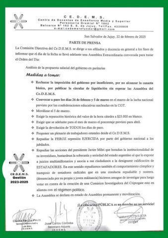 - Convocar a un paro los días 24 de febrero y 5 de marzo, adhiriendo a la medida nacional impulsada por las confederaciones educativas nucleadas en la CGT.
