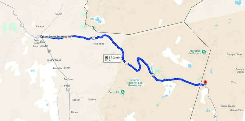 Distancia desde San Pedro de Atacama hasta el Paso de Jama