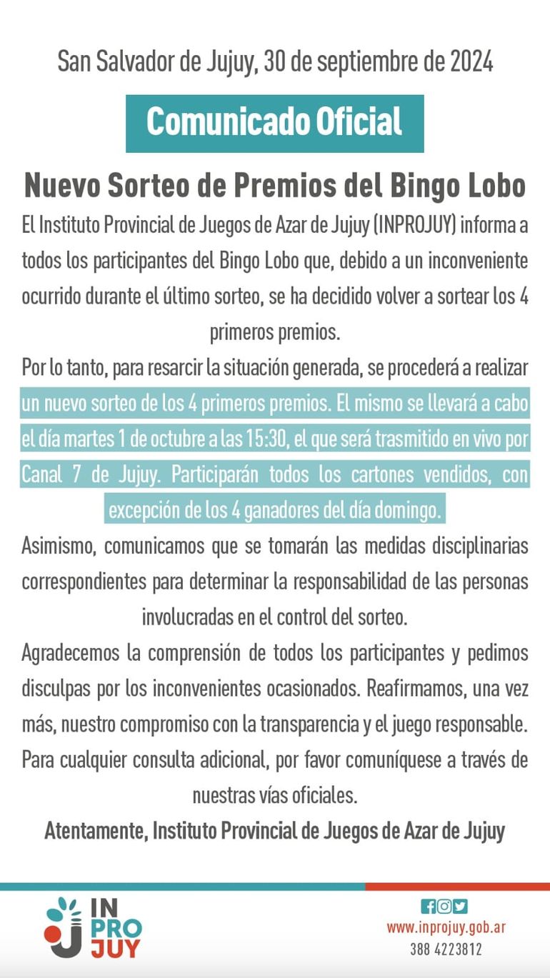 “El Instituto Provincial de Juegos de Azar de Jujuy informa a todos los participantes del Bingo Lobo que, debido a un inconveniente ocurrido durante el último sorteo, se ha decidido volver a sortear los 4 primeros premios”.