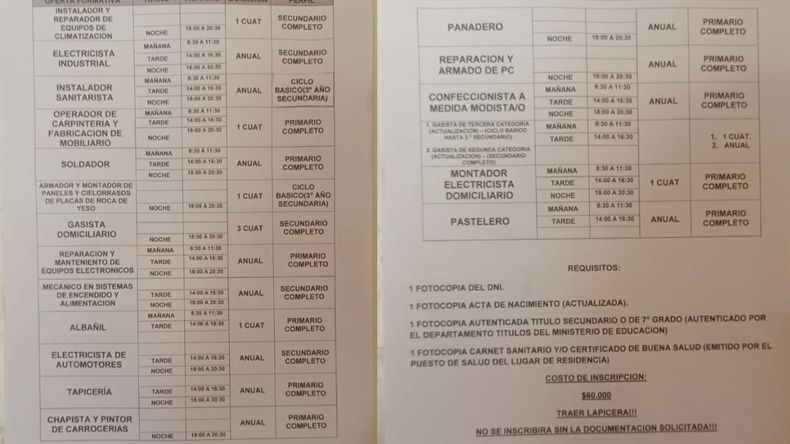 En el caso de carpintería y de las nuevas propuestas, la modalidad pasó a ser cuatrimestral. “Hay ofertas que son de cuatro meses. Generalmente manejábamos todas anuales, pero algunas cambiaron la modalidad”, detalló Mamani.