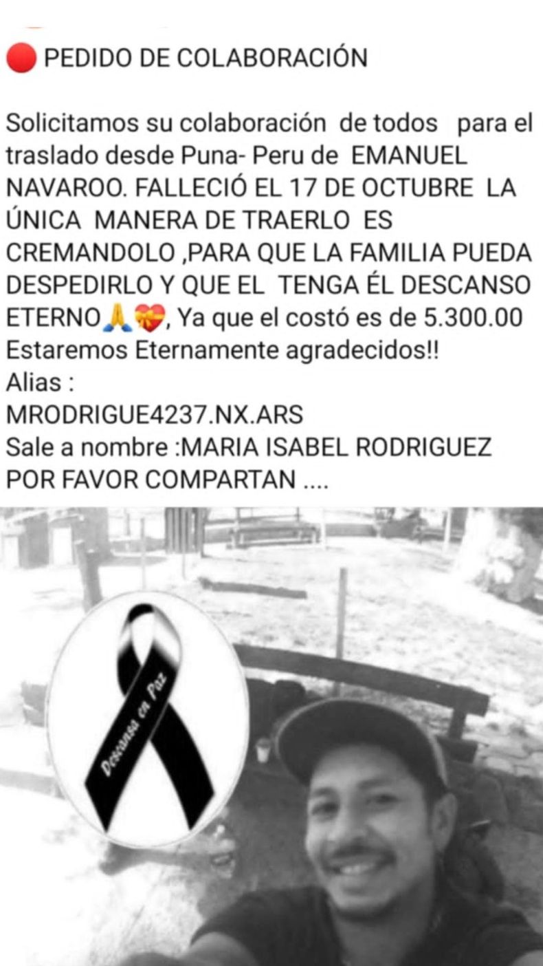 A través de la redes sociales se pudo conocer el desesperado pedido de una familia jujeña que lamentablemente perdió a uno de sus integrantes lejos del país. Se trata de Emanuel Navarro quien falleció en Perú, necesitan trasladar el cuerpo a la provincia y el costo para hacerlo es muy alto.