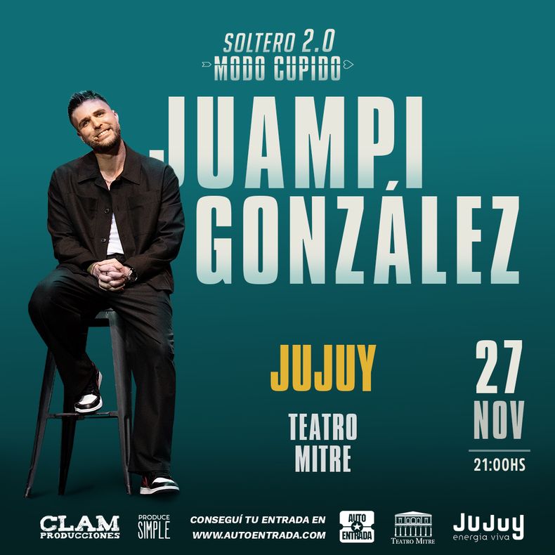 El jueves 27 de noviembre desde las 21 horas, Juampi González estará en el Teatro Mitre con el show “Soltero 2.0 Modo Cupido”. Por primera vez el humorista estará en suelo jujeño para brindar un espectáculo que promete un recorrido por las maravillas y expectativas que existen en el mundo de la soltería…o del vértigo de ser soltero.