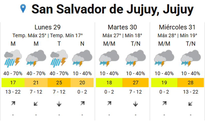 El Servicio Meteorológico Nacional en la actualización, pronostica también para el día martes 30, tormentas para todo el territorio jujeño, por la tarde y noche.