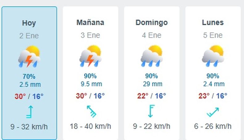 El domingo 4 de enero marca máxima de 22°C y mínima de 16°C. La probabilidad de lluvia es del 30%, con tormentas aisladas y chaparrones por la tarde y la noche.