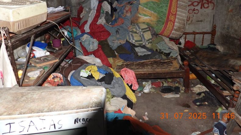 Se secuestraron también una olla a presión, una licuadora, varias ollas comunes, cubiertos, recipientes plásticos, guantes, ropa en desorden y calzado sin cordones. Algunos de estos objetos estaban quemados o parcialmente destruidos. En una de las paredes se leían nombres escritos como “Isaias” y “Negro”, mientras que un graffiti decía “Cartu Isaias los quiero”.