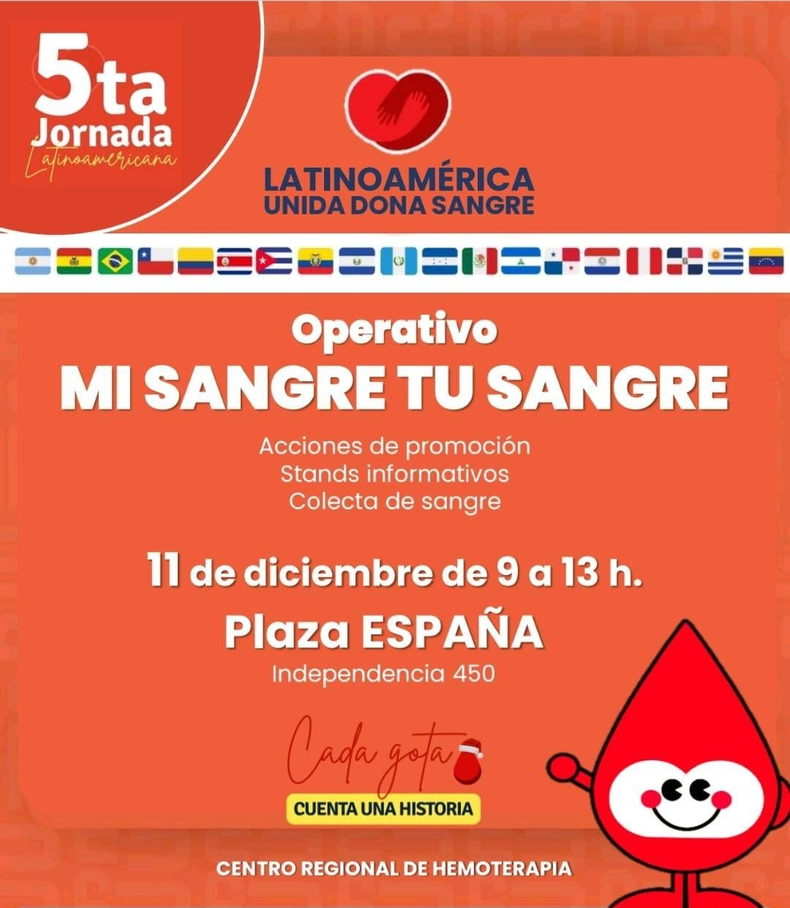 En el marco de la 5ta Jornada Latinoamericana “Latinoamérica Unida Dona Sangre”, que se realiza de manera simultánea en 19 países, el Centro Regional de Hemoterapia de Jujuy llevará adelante un importante operativo este jueves 11 de diciembre, de 9 a 13 horas, en Plaza España (Independencia 450).