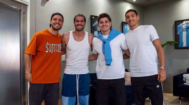 Emiliano “Dibu” Martínez, Lisandro Martínez, Cristian “Cuti” Romero, Enzo Fernández y Facundo Buonanotte enfrentaron dificultades para llegar a Argentina desde Inglaterra y arribaron recientemente, por lo que se dirigieron directamente al gimnasio.