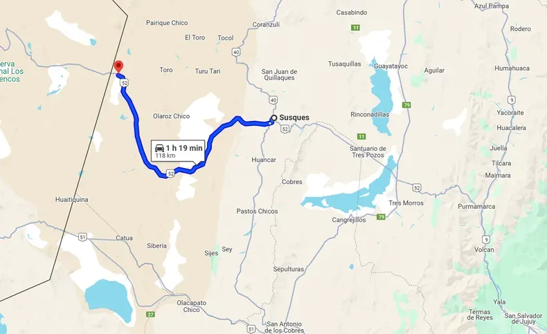 La distancia por ruta desde Susques, Jujuy, hasta el Complejo Fronterizo de Paso de Jama es de aproximadamente 155 kilómetros, con un tiempo estimado de viaje en coche de alrededor de 1 hora y 20 minutos. Este tramo corresponde a la Ruta Nacional Nº 52, que está asfaltada y en buenas condiciones, y conecta directamente Susques con el paso fronterizo ubicado a una altitud de unos 4.200 metros sobre el nivel del mar.