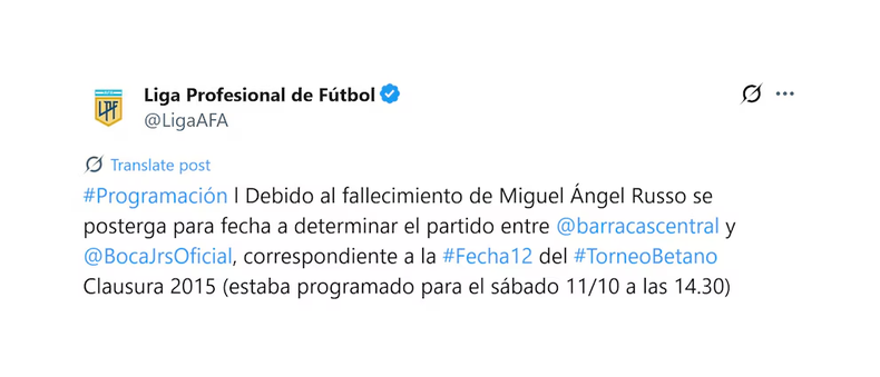 “Debido al fallecimiento de Miguel Ángel Russo, se posterga para fecha a determinar el partido entre Barracas Central y Boca Juniors”, comunicó la Liga en su cuenta oficial de X.