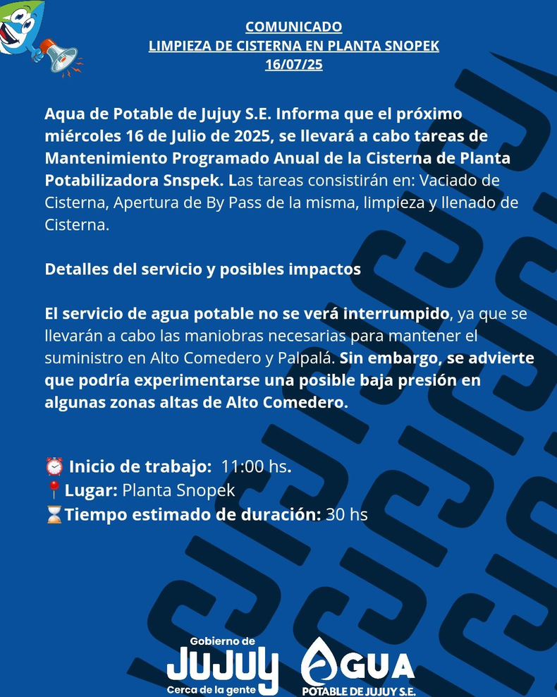 Las tareas incluirán el vaciado de la cisterna, apertura de By Pass, limpieza y posterior llenado del sistema. Si bien se garantizó que el servicio no se verá interrumpido en Alto Comedero y Palpalá, se advirtió que podría registrarse una baja presión en algunas zonas altas de Alto Comedero.