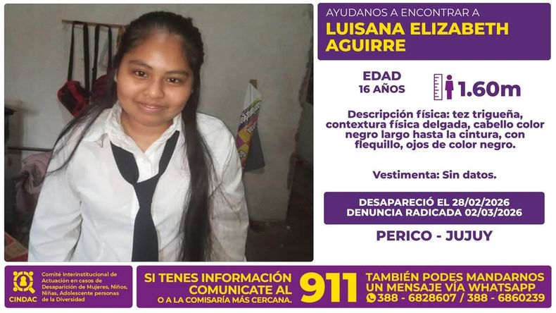 Según detallaron oficialmente, la joven se encuentra desaparecida desde el 28 de febrero de 2026, mientras que la denuncia fue radicada el 2 de marzo en la ciudad de Perico, provincia de Jujuy.