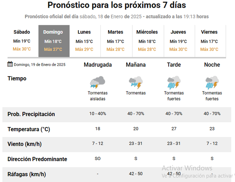 El pronóstico para el lunes 20 de enero no es alentador. En San Salvador de Jujuy, se anticipa una temperatura mínima de 15°C y una máxima de 29°C, con una humedad del 41%. La probabilidad de lluvia se mantiene entre el 40% y el 70%, con tormentas esperadas durante la mañana y chaparrones aislados por la tarde. Esta situación podría afectar actividades al aire libre y generar complicaciones en el tránsito.