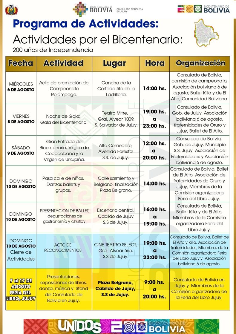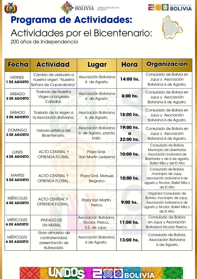El cónsul remarcó que los festejos se extenderán durante toda la semana. Ya se realizaron actividades en Libertador General San Martín y este miércoles 6 de agosto los actos continuarán en Perico, mientras que el viernes por la noche se vivirá una celebración especial en calle Mitre, y el sábado una gran entrada folclórica con más de 20 fraternidades y la presencia del Carnaval de Oruro.