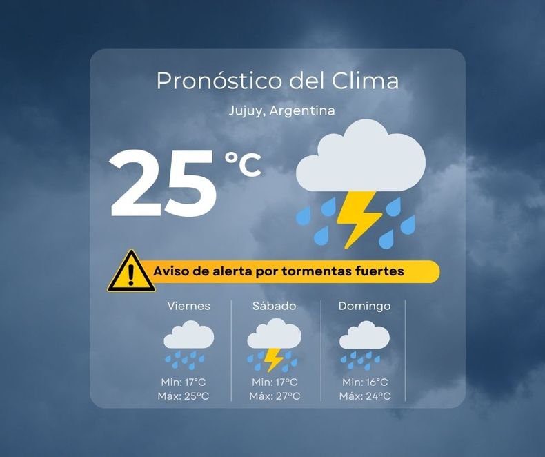 Este 16 de enero, el Servicio Meteorológico Nacional (SMN) renovó la alerta amarilla por fuertes tormentas para gran parte de la provincia de Jujuy. Durante la jornada de hoy, desde la mañana y a lo largo de la tarde, se prevén tormentas de variada intensidad, algunas localmente fuertes, con posible caída de granizo, intensa actividad eléctrica, abundante precipitación en cortos períodos y ráfagas de viento.