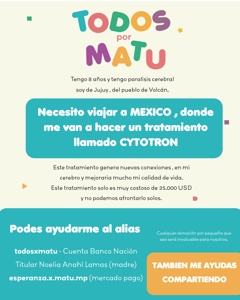 Quienes deseen colaborar pueden hacerlo a través del alias todosxmatu (Banco Nación – titular Noelia Anahí Lamas) o mediante Mercado Pago al alias esperanza.x.matu.mp. También es posible ayudar compartiendo la campaña en redes para llegar a más personas.