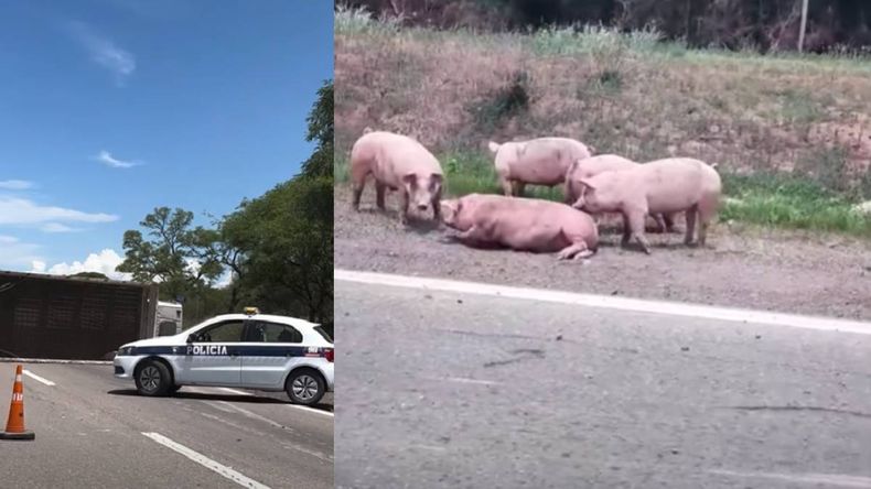 Un camión protagonizó un vuelco este sábado al mediodía sobre la Ruta Nacional 66, en inmediaciones de Palo Marcado, lo que obligó a interrumpir el tránsito de manera preventiva. El siniestro provocó que algunos de los cerdos que trasladaba, quedaran dispersos sobre la calzada y la banquina, mientras que otros, resultaron heridos.